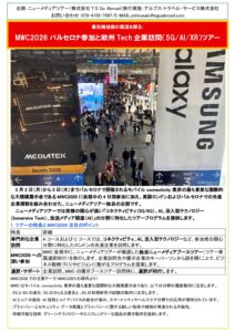 3月2日(月)から5日(木)までバルセロナで開催されるモバイルconnectivity業界の最も重要な国際的な大規模展示会であるMWC2026に会期中の4日間参加に加え、英国ロンドンおよびバルセロナでの先進企業視察を組み合わせた、ニューメディアツアー独自の企画です。